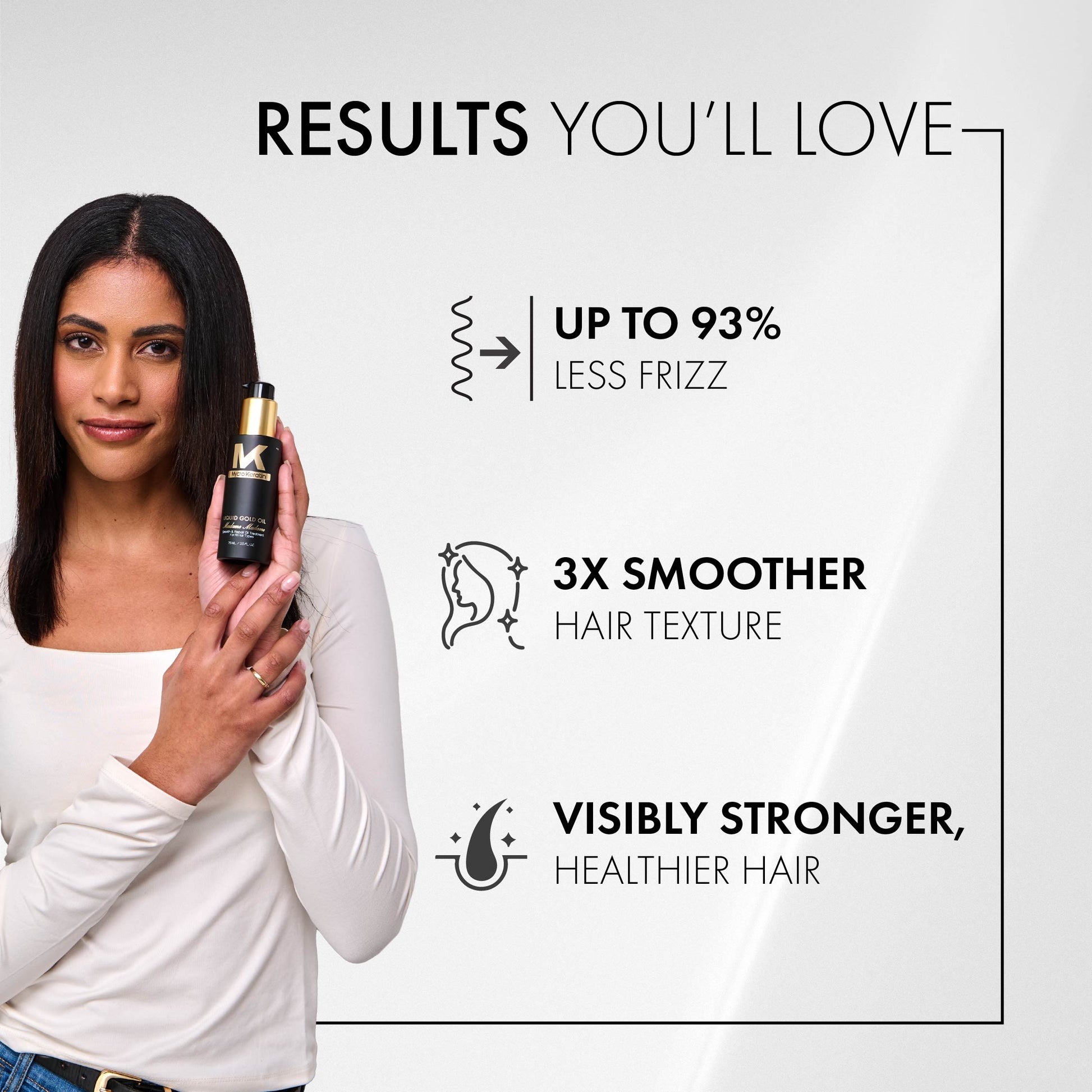 Unveil the secret to luxurious, salon-worthy hair with Mycro Keratin Madame Madame Liquid Gold. This sumptuous hair oil is your ticket to an intensive repair and smoothing experience like no other. Perfect for achieving a sleek blowout or elevating the polish of dry, damaged hair, this oil is versatile enough for all hair types and textures, whether fine, thick, wavy, curly, kinky, or straight.