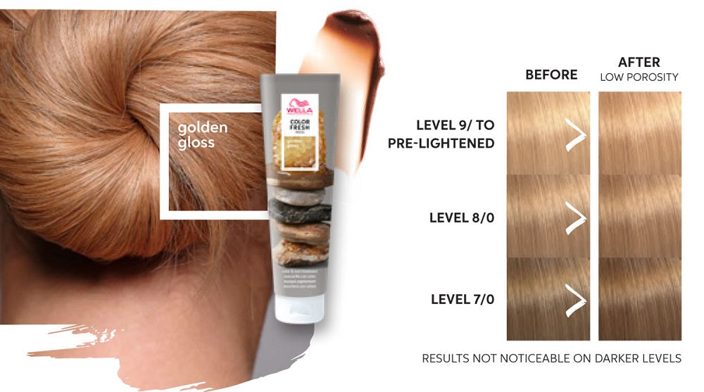 Unveil a new dimension of hair brilliance with the Wella Color Fresh Golden Gloss Mask! This luxurious, zero-damage color-depositing mask offers you the freedom to experiment with your look effortlessly. In just 10 minutes, infuse your pre-lightened hair with a radiant golden hue that captures attention and transforms your overall appearance. Designed for at-home convenience, this mask gradually fades, leaving behind not just color, but also revitalized, smooth, and moisturized strands.